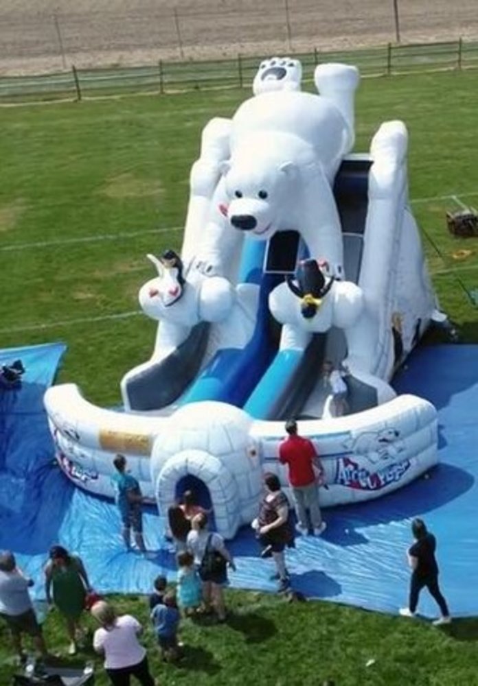 Bring the winter season to your summer party with this "cool" dual-lane slide! The Arcric Plunge Slide is over 30ft long, stands 20ft tall, and features charming polor characters. Its frigid design is perfect for Christmas in July parties, or anything winter themed.