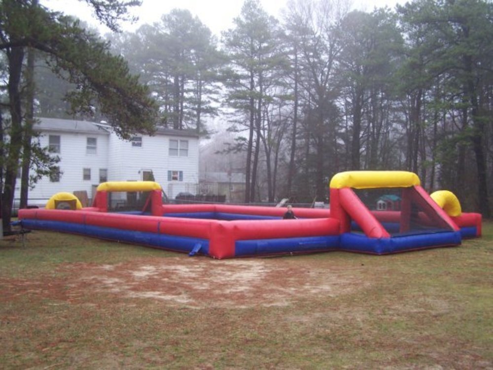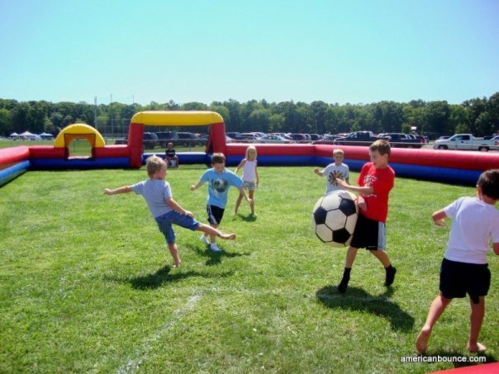 Sports Arena is a huge hit with all age groups. Measuring 75' long x 50' wide x 8' high the whole family can enjoy playing soccer together. Great for school events, soccer tournaments or backyard parties this unique inflatable is fun for all. American Bounce will supply the over sized soccer ball, creating oversized fun! With up to 16 partisipants at once, this interactive is sure to draw in a large crowd.