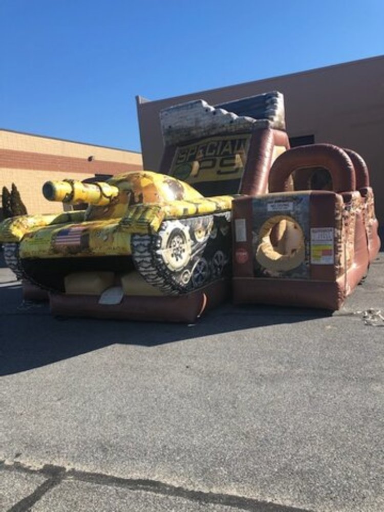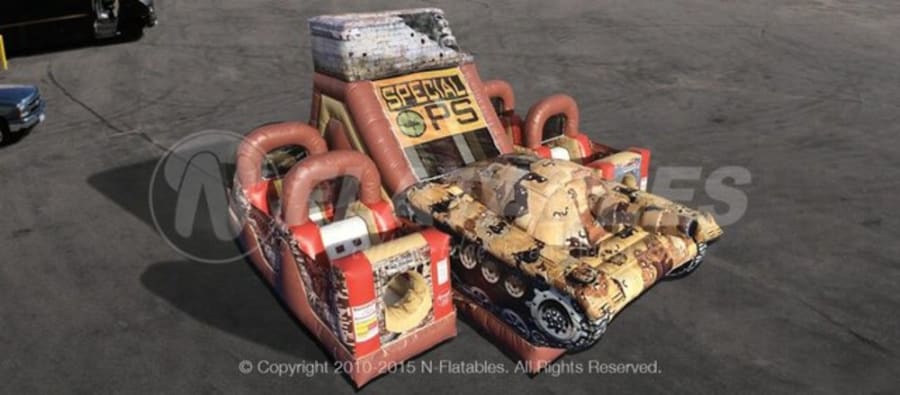 Ensure "protection" your party's fun with this tank themed obstacle course! Two opponents can race through this military-themed obstacle course: practice your army crawl through the tunnels. Bob and weave tthough the pops ups and climb to to the top of the slide. The fastest riders can enjoy thier victory as they come out from underneath the army tank. This inflatable is great for school events, corporate team training and backyard parties.