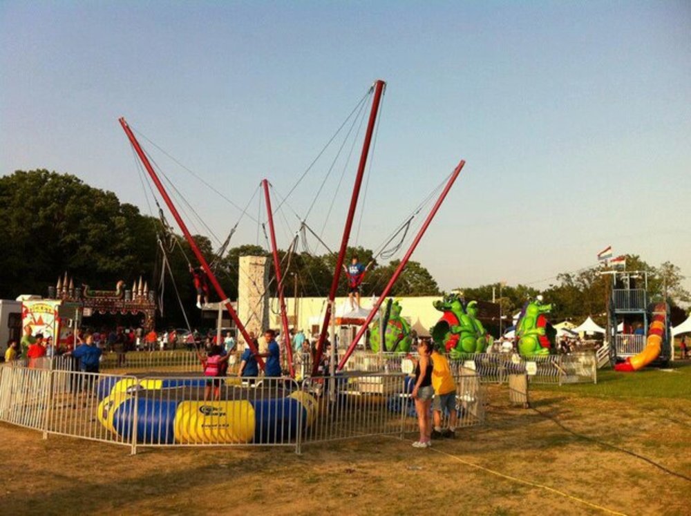 The participant is first centered on one of our inflatable trampolines, then secured in a custom adjustable harness by a trained operator. The combination of an electric winch and power cords allow the jumper to catapult up to 24 feet in the air! This combination system of lifting and use of elastimers dramatically enhances the jumpers ability to perform front and back somersaults as well as reaching heights that would normally be impossible.