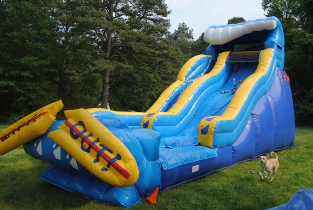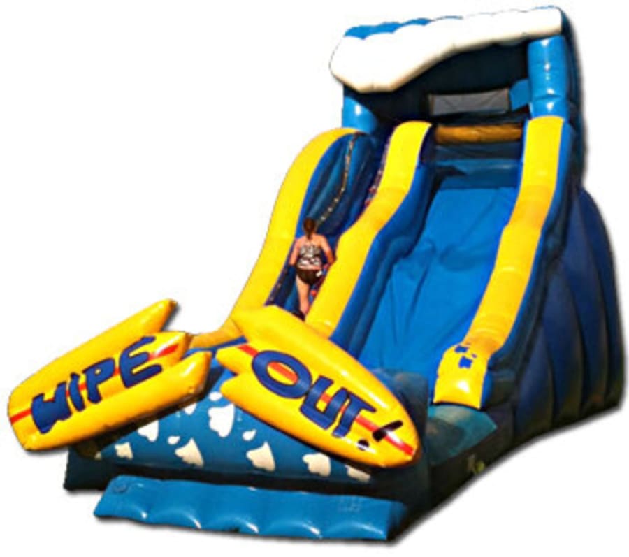 Surf the waves with our 19' Wipeout Water Slide! This fan favorite of 10 years has a surprise bump about halfway down the slide that will get the kids' attention quick. This slide is fun for younger and older participants, making it perfect for a family of all ages.