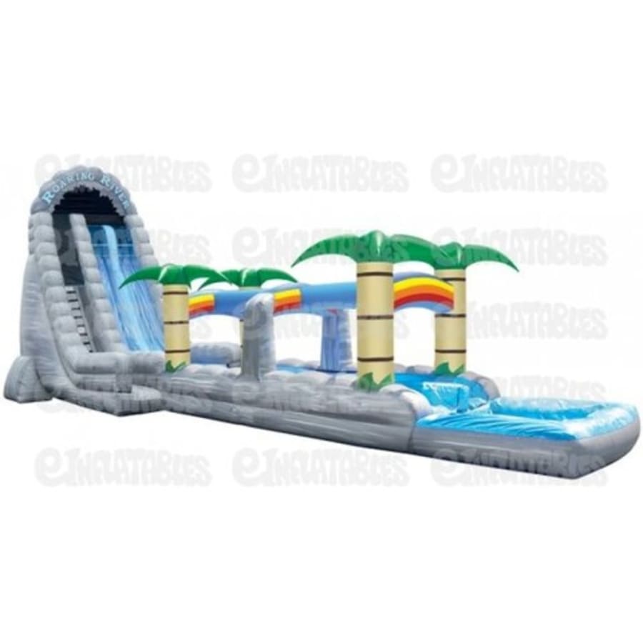The Tropical Falls is a new addition to our 27' dual lane waterslides! This tropical, rocky waterfall themed slide features a radical sliding angle that's sure to get the adrenaline racing. At the bottom, riders continue down 26' of additional sliding fun before landing in a pool. At over 60' long, this water slide will blow your mind! It's perfect for schools, churches, summer camps or backyard parties. Anyone who want's to get their heart pumping will love this slide!