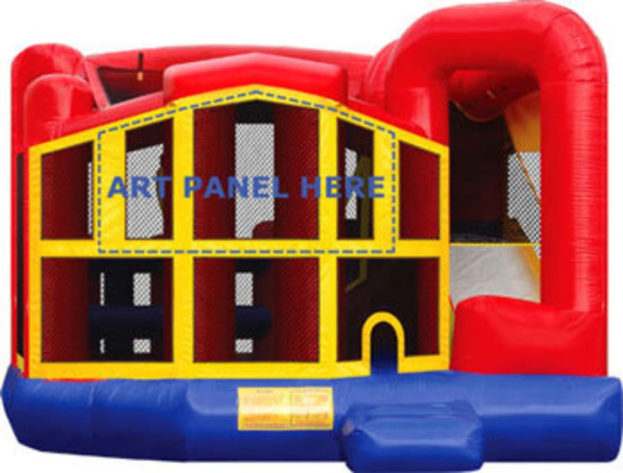 The 5-in-1 combo style bounce house is the ultimate in inflatable jumpers! The large interior jumping area offers a basketball hoop and both log and pop-up obstacles. This bouncy castle has a climb feature and a convenient exit slide for hours of active fun! Parents and spectators are offered a clear view with the 360-degree mesh sides of this moonwalk. The 5-in-1 combo bounce house is made of lite n strong™ fire-resistant vinyl for safety, durability and easy portability. This 5-in-1 bouncy house is sure to make any indoor or outdoor event a great success!